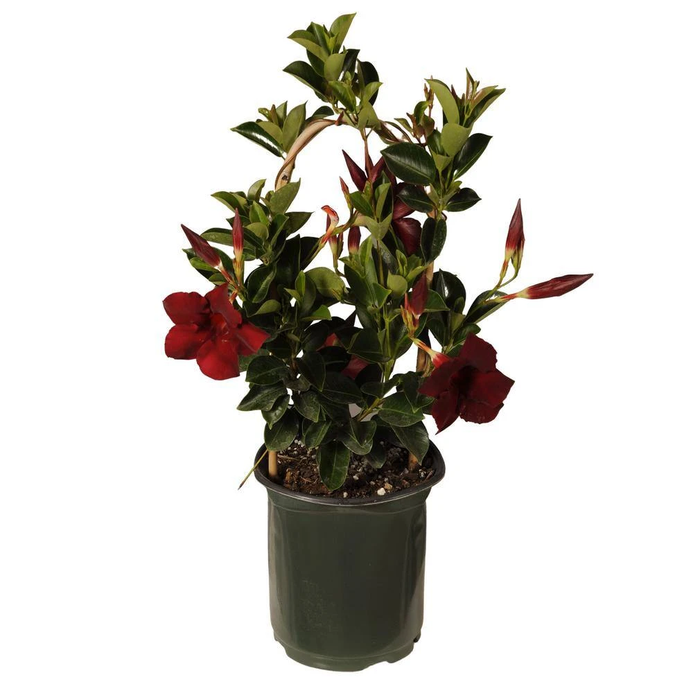 The Mandevilla Hoop Crimson Red flowering plant is a durable and attractive easy care plant that has become an outdoor favorite. The beautiful mandevilla flowers add a tropical flair to any landscape project producing bloom during summer. The different shades of bloom vary from pink, yellow and white, depending on the variety. Plants help decrease stress and anxiety while stimulating creativity and productivity. Great for yourself or as a gift.