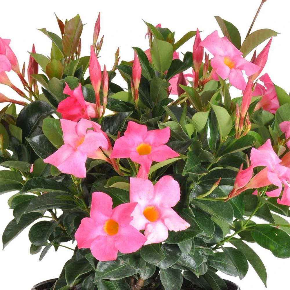The Dipladenia could be called the perfect flowering plant since it meets all of the following in a checklist. It is not too big nor too small, has lots of flowers, is easy to transplant and works well inside pots, hanging baskets and in the ground. Bring color to your home garden with our selection of beautiful dipladenias available only in spring time. Great for yourself or as a gift. This plant is shipped in a premium 10 in. Dia polypropylene pot and to prevent water spillage the pot does not contain holes.