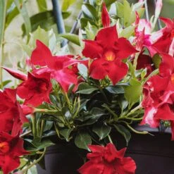 - Red flower blooms – nothing says tropical living like this Mandevilla which puts out colorful trumpet-shaped red blooms along its woody, twining stems