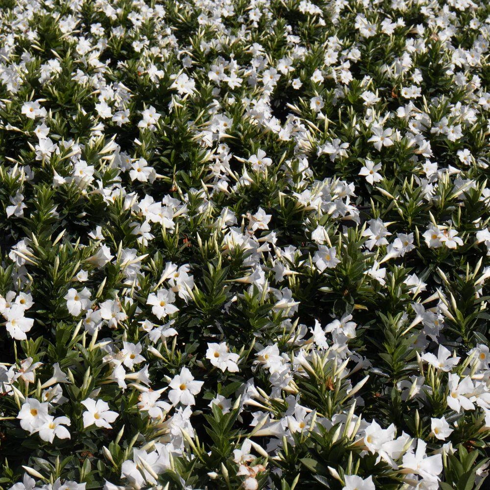 - White flower blooms – nothing says tropical living like this mandevilla which puts out colorful trumpet-shaped pink blooms along its woody, twining stems