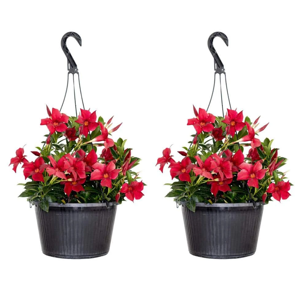 This 2-pack of Mandevilla Hanging Basket produce large Red flowers that span from 2 in. to 3 in. and create an elegant tropical look. Natural climbers, these beauties are stunning in a hanging basket and in patio pots. Nothing says summer like dramatic Red Flowers. Bring these lovely plants poolside and create a tropical paradise. Mandevilla’s enjoy light and heat and perform best in warm temperatures between 65° to 90° and high direct light levels. Mandevilla needs to be planted in full sun in order to flower well. It will tolerate a range of soils, as long as the soil is well drained. Mandevilla needs to be watered and fertilized regularly. Plants help decrease stress and anxiety while stimulating creativity and productivity. Great for yourself or as a gift.