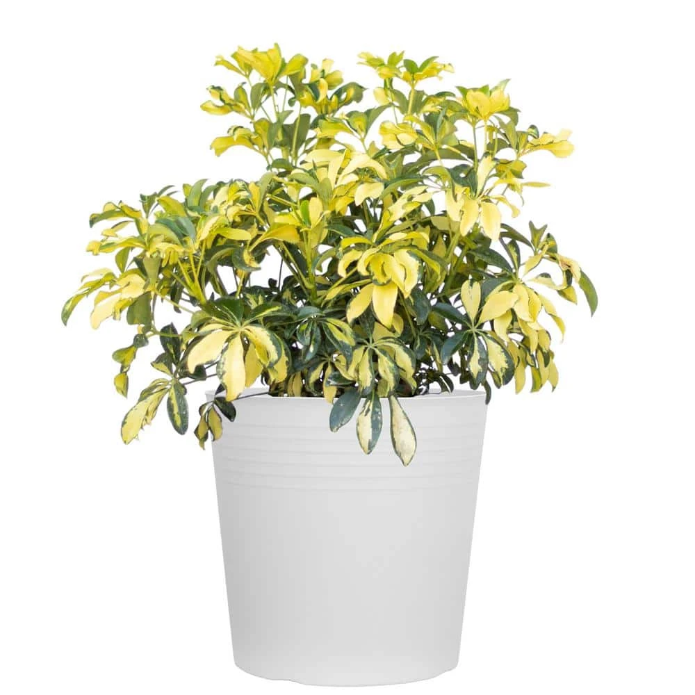 Grown by United Nursery, the Schefflera Trinette, also known as the Umbrella Tree is commonly grown as a houseplant and can easily double as an outdoor patio plant. This variegated variety of umbrella plant has large patches of creamy yellow lighting up its foliage. Perfect for brightening a room solo or enlivening a mix of green-leaved plants. Schefflera may initially drop leaves as they adjust to a new setting as they are really vigorous and easy-care plants. They may be pruned to control height or shape. Indoor house plants are proven to be excellent air purifiers that removes pollutants and chemicals from the air for healthy living. Studies show that house plants can decrease stress and anxiety and stimulate creativity. Great for yourself or as a gift.